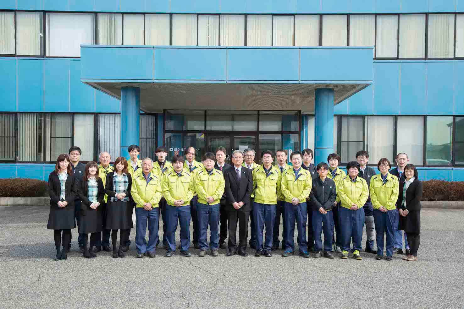周年ロゴの周りに火花を散らしながら鉄骨と向き合う職人の写真をコラージュし、ものづくりに対するひたむきな想いを表現しています。また、新潟白根第二工場をバックにした別パターンも制作しています。